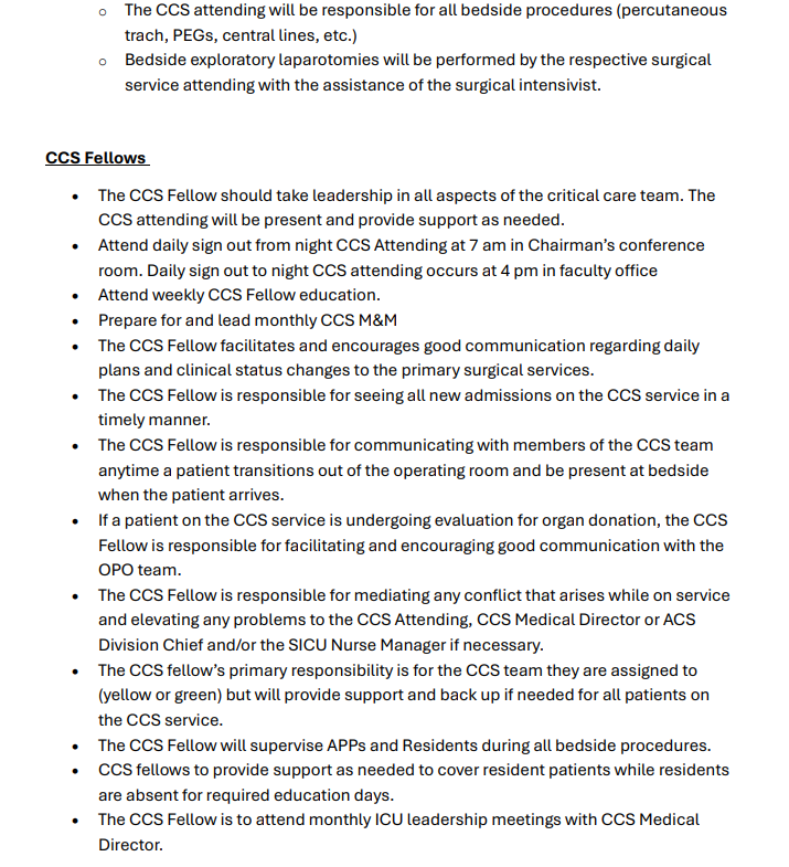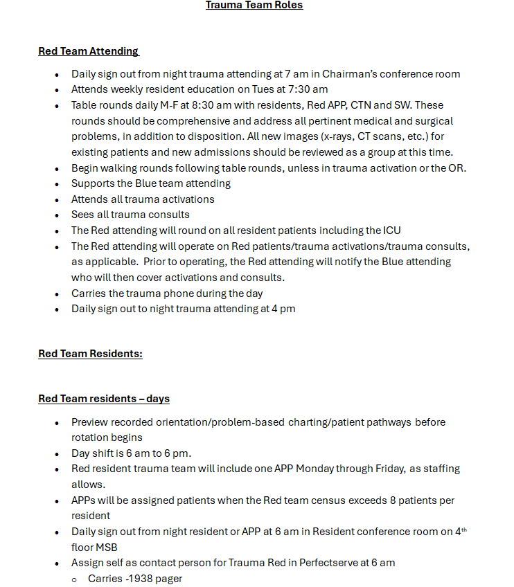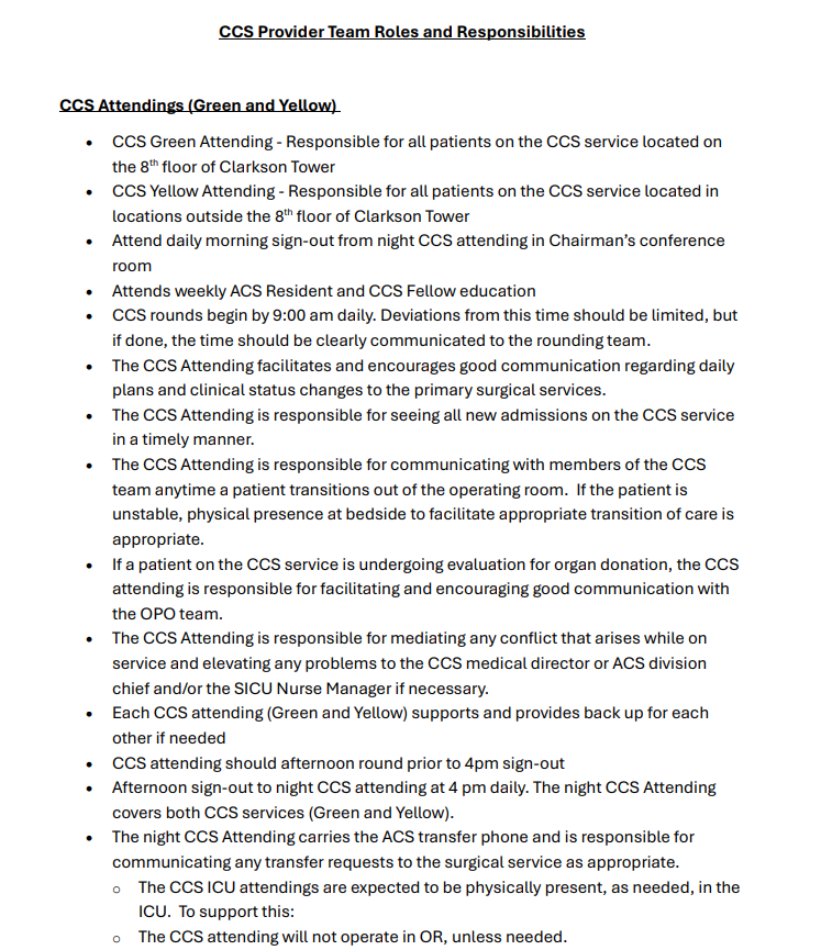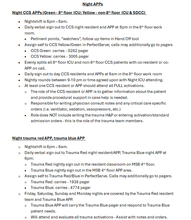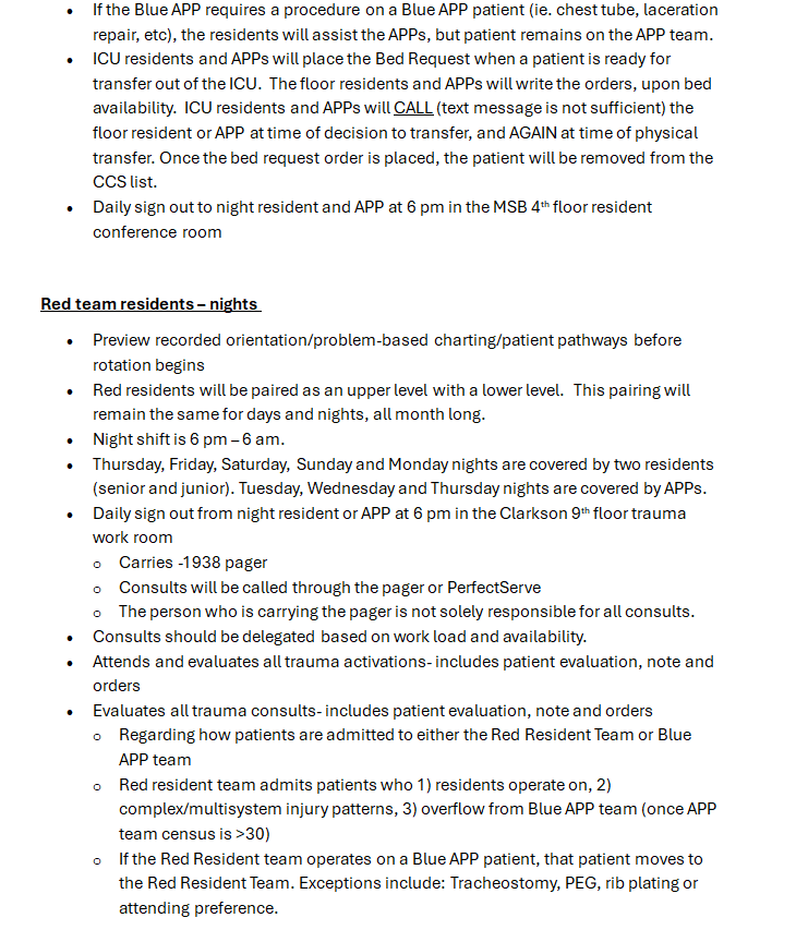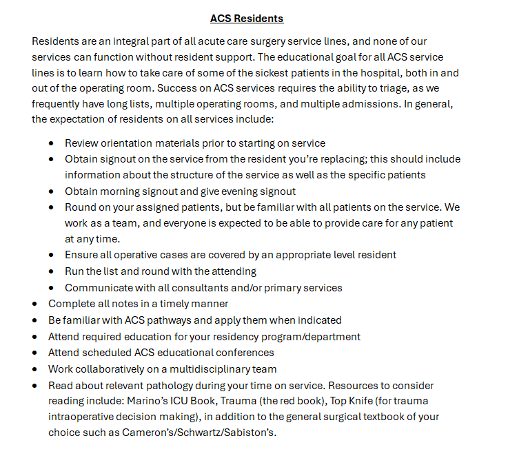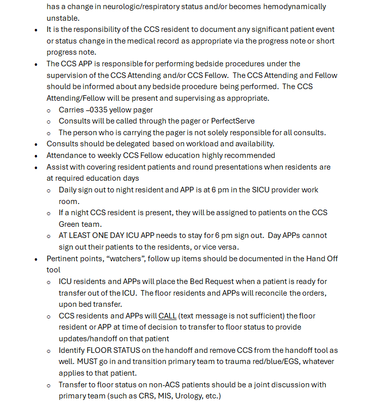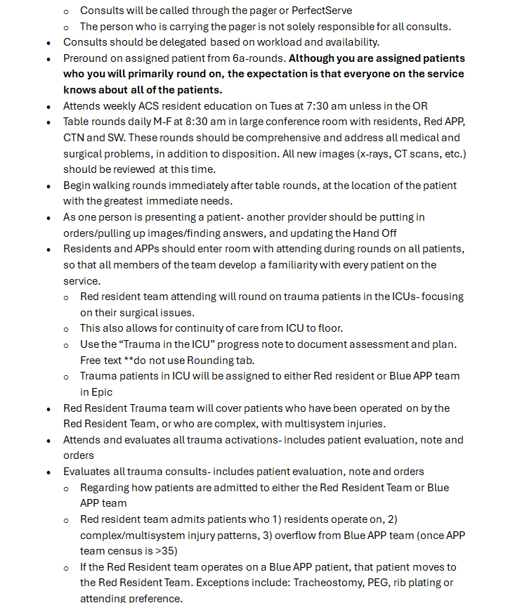Purpose: The purpose of this document is to outline the roles and responsibilities for each team member providing patient care on the Acute Care Surgery service in order to provide coordinated and timely care. This document serves as a guideline that can and should be adjusted according to the needs of the patient and the needs of other patients requiring concurrent care.