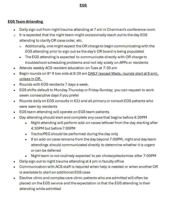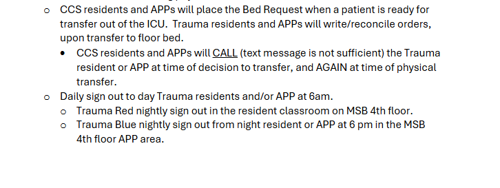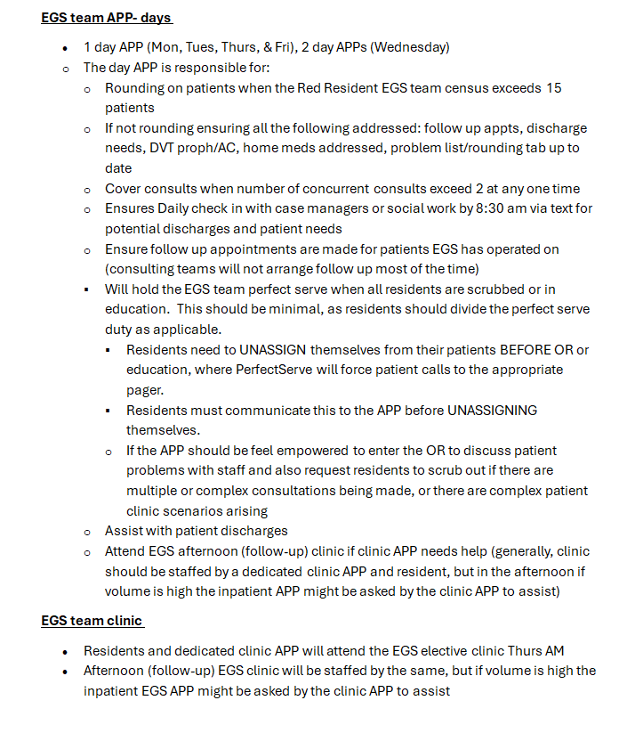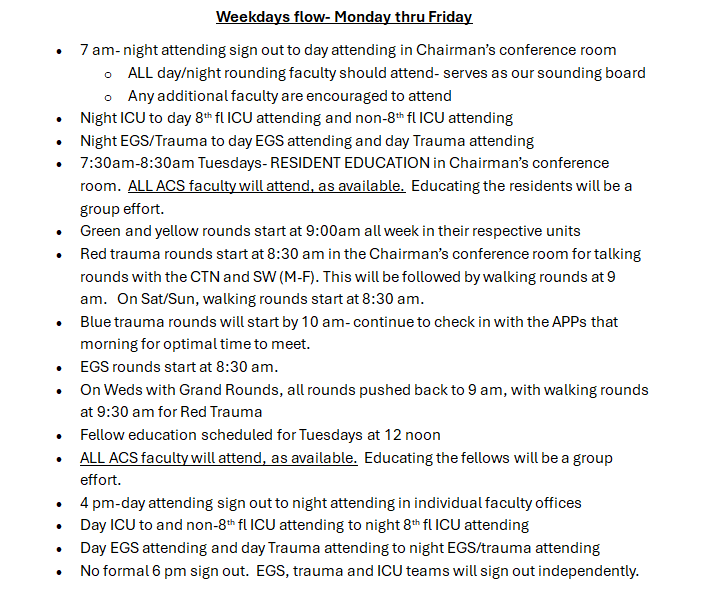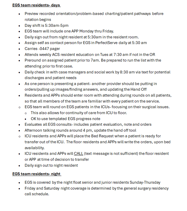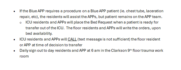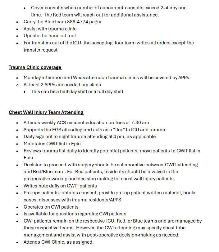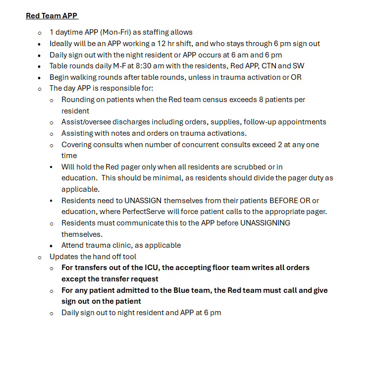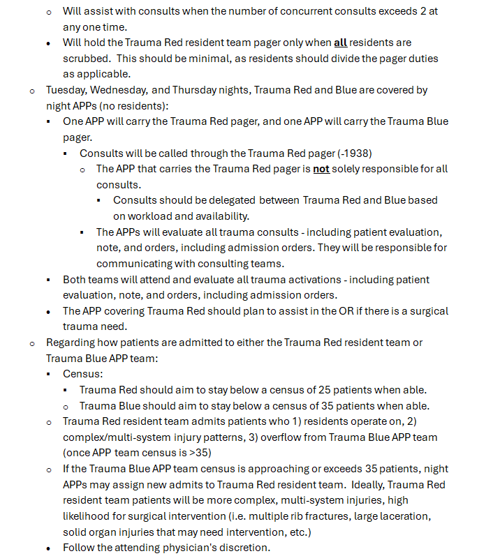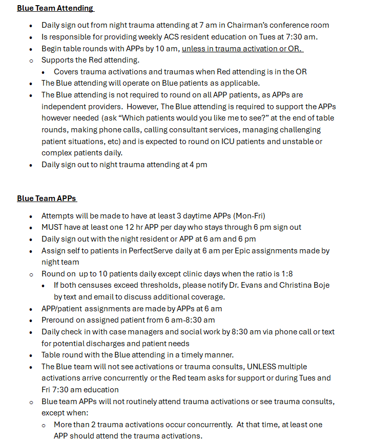 Purpose: The purpose of this document is to outline the roles and responsibilities for each team member providing patient care on the Acute Care Surgery service in order to provide coordinated and timely care. This document serves as a guideline that can and should be adjusted according to the needs of the patient and the needs of other patients requiring concurrent care.