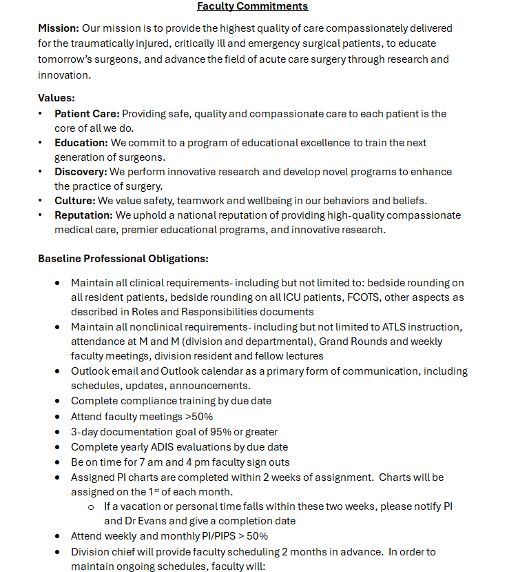 • Teamwork: Acute Care Surgery includes multiple service lines, each unique to their patient population and staff coverage.  In addition, we are one team with one mission- to offer the highest level of care to our patients.  We will support each other in any way needed to achieve our mission.