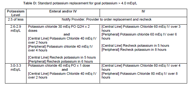 - The potassium level is below threshold specified by Table C or D.
