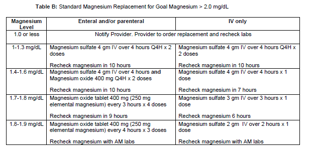 - The magnesium level is below threshold specified by Table A or B.