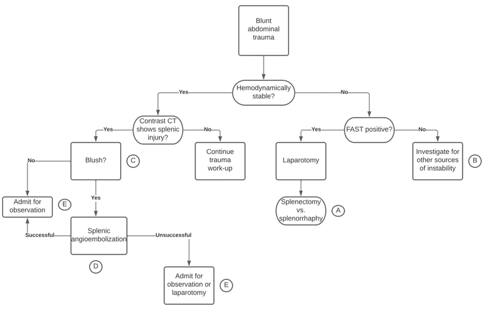 - Rowell SE, Biffl WL, Brasel K, et. al. Western Trauma Association critical decisions in trauma: Management of adult blunt splenic trauma—2016 updates. J Trauma Acute Care Surg. 2016; 82(4): 787-93.