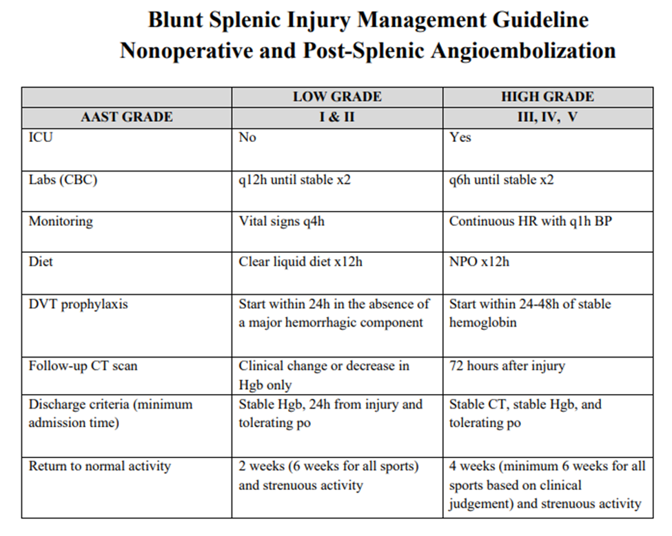 - All patients with splenic injury should follow-up in trauma clinic 1-2 weeks following discharge pending clinical status at time of discharge and hospital length of stay following injury.