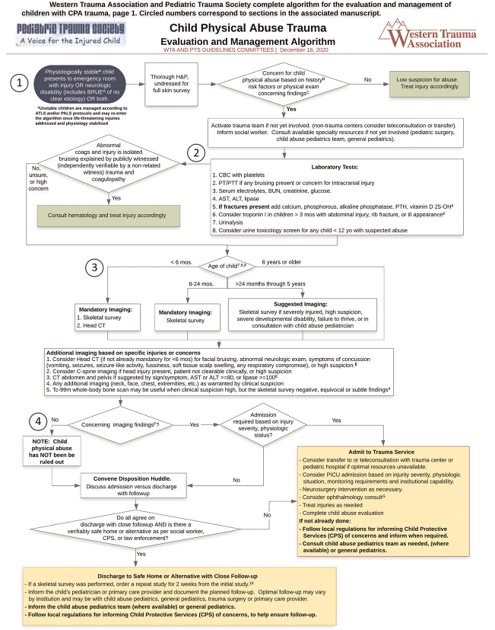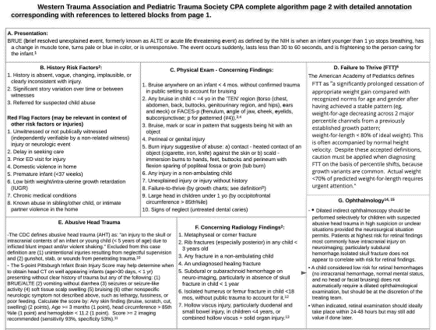 - Rosen NG, Escobar MA, Brown CV, et al. Child physical abuse trauma evaluation and management: A Western Trauma Association and Pediatric Trauma Society critical decisions algorithm. J Trauma Acute Care Surg.2021; 90(4): 641-651.