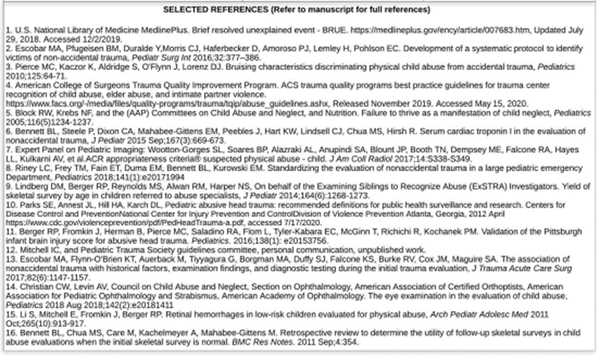 - Pierce MC, Kaczor K, Lorenz DJ, Bertocci G, Fingarson AK, Makoroff K, Berger RP. Validation of a clinical decision rule to predict abuse in young children based on bruising characteristics. JAMA Netw Open. 2021; 4(4):e215832.