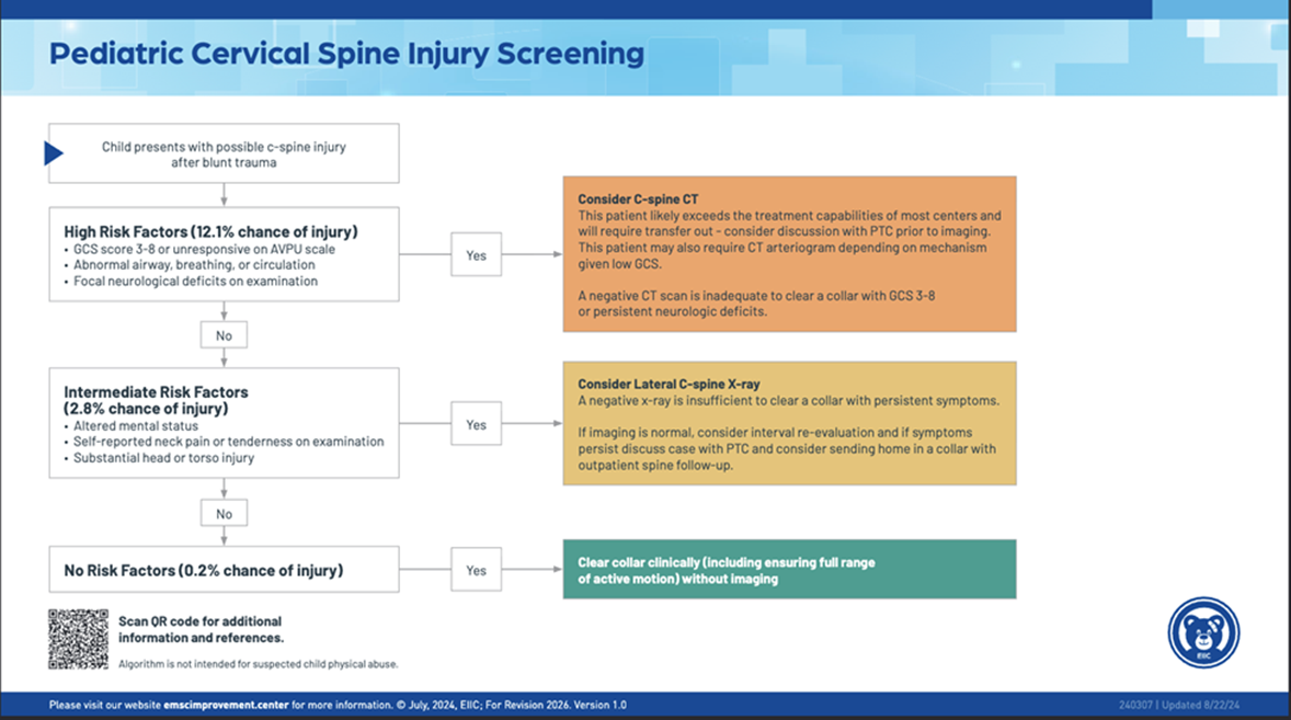 - Leonard JC, Harding M, Cook LJ, et a.l PECARN prediction rule for cervical spine imaging of children presenting to the emergency department with blunt trauma: a multicentre prospective observational study. Lancet Child Adolesc Health. 2024 Jul; 8(7):482-490.