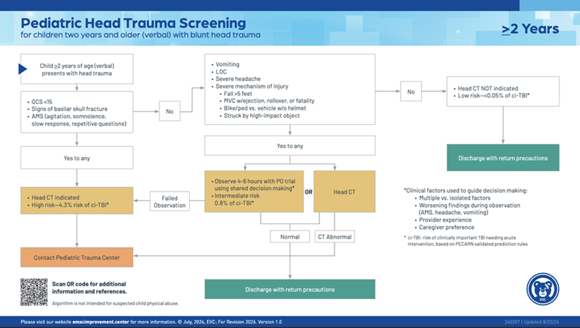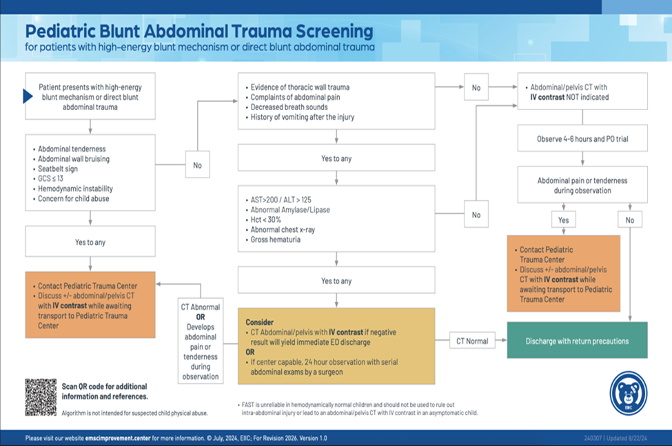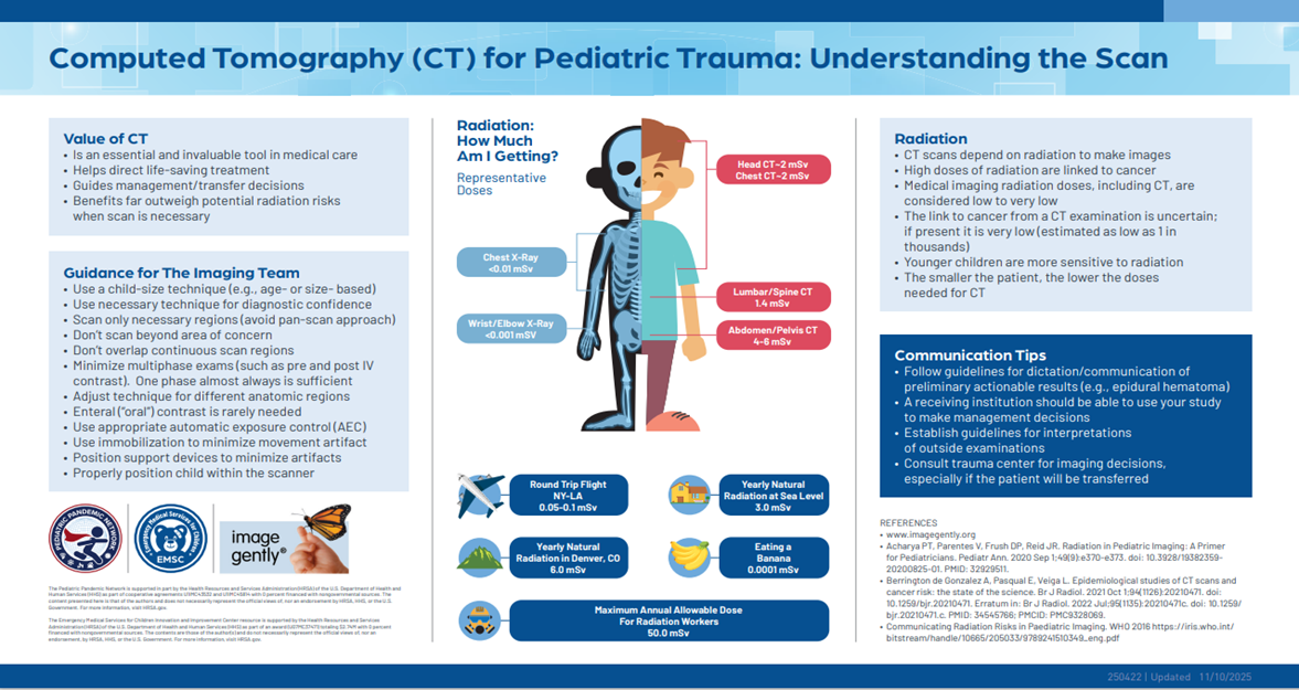 - Emergency Medical Services for Children Innovation and Improvement Center (EIIC) (2025). EIIC: Best Practices in Pediatric Trauma Imaging. https://emscimprovement.center/education-and-resources/peak/multisystem-trauma/imaging/