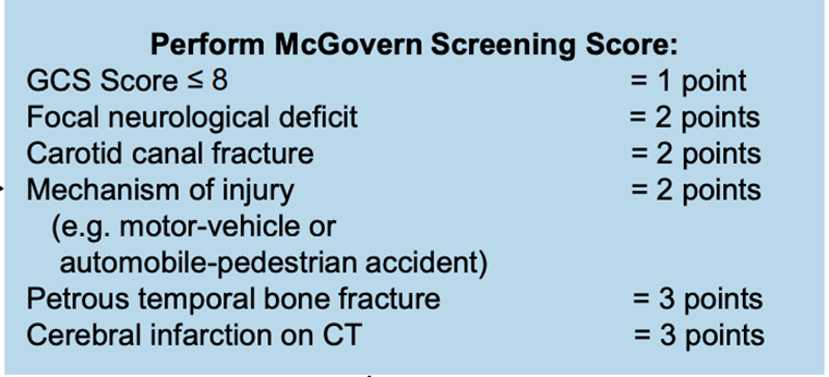 - A score of ≥3 points is high-risk for BCVA and CTA neck should be performed.