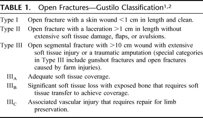 | Type III (A-D) fracture | open segmental fracture, open fracture with extensive soft tissue damage, or traumatic amputation. |