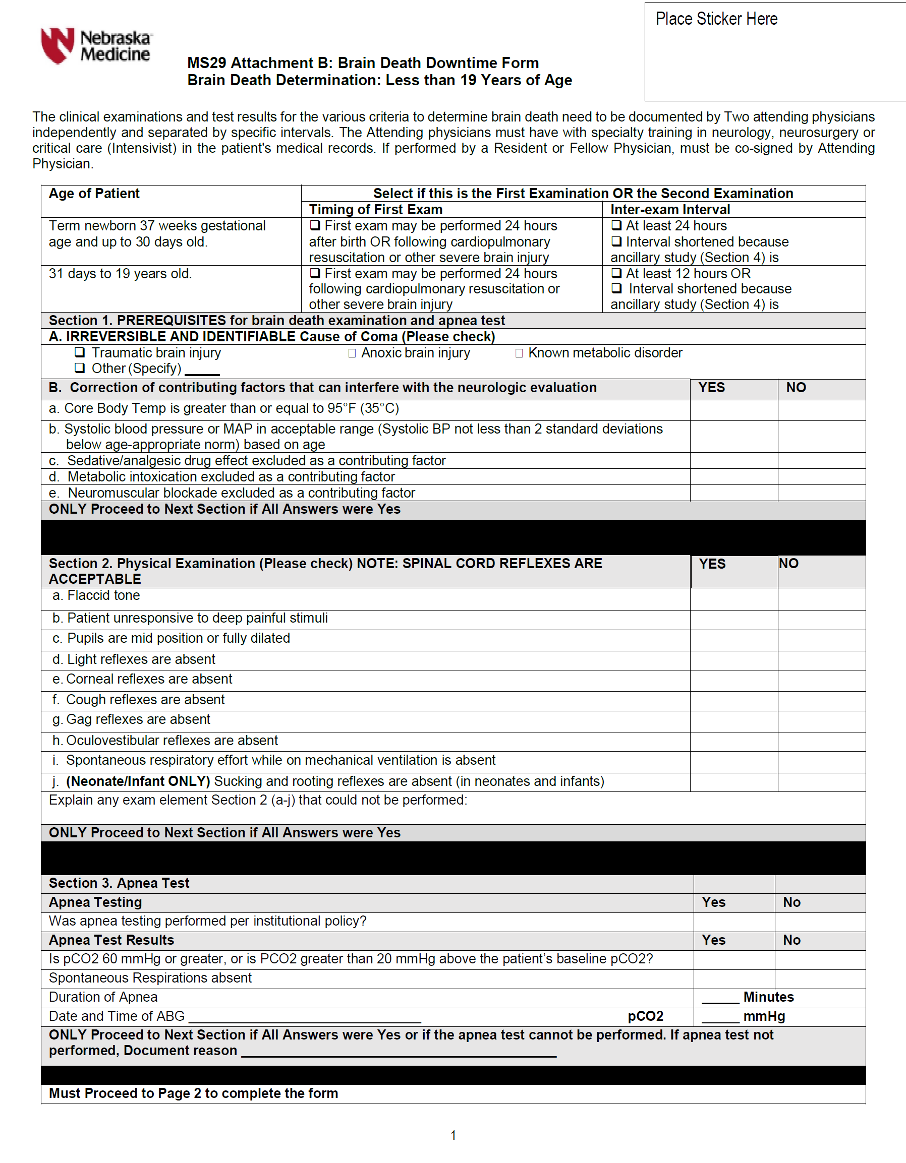 1. Infants and children (i.e., term newborns and children up to 19 years of age) require a waiting period of 24 hours before an initial brain death examination is performed following a cardiopulmonary resuscitation or severe acute brain injury. Please complete Checklist Attachment B electronically (unless in a downtime situation) when completing the evaluation. Two brain death examinations, separated by an age-dependent observation period are required as outlined below. Apnea testing is required for each examination.