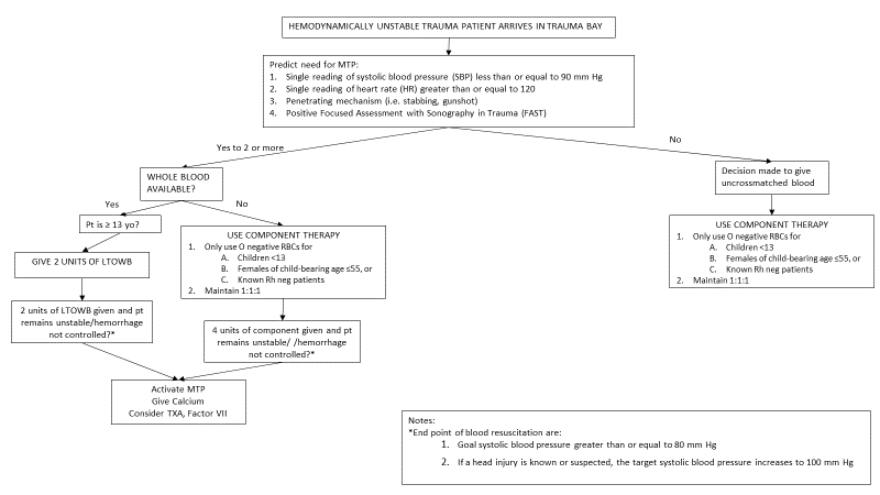 The implementation of a whole blood program at Nebraska Medicine is designed to optimize our resuscitation practices for the hemorrhaging trauma patient. Whole blood, specifically Low Titer O Whole Blood (LTOWB) immediately delivers a balanced product with less preservative than individual components. It also has the advantage of being more convenient by giving one product instead of three to achieve a balanced transfusion ratio. The goal of this document is to standardize the management of resuscitation with LTOWB for hemorrhagic shock from a traumatic mechanism.